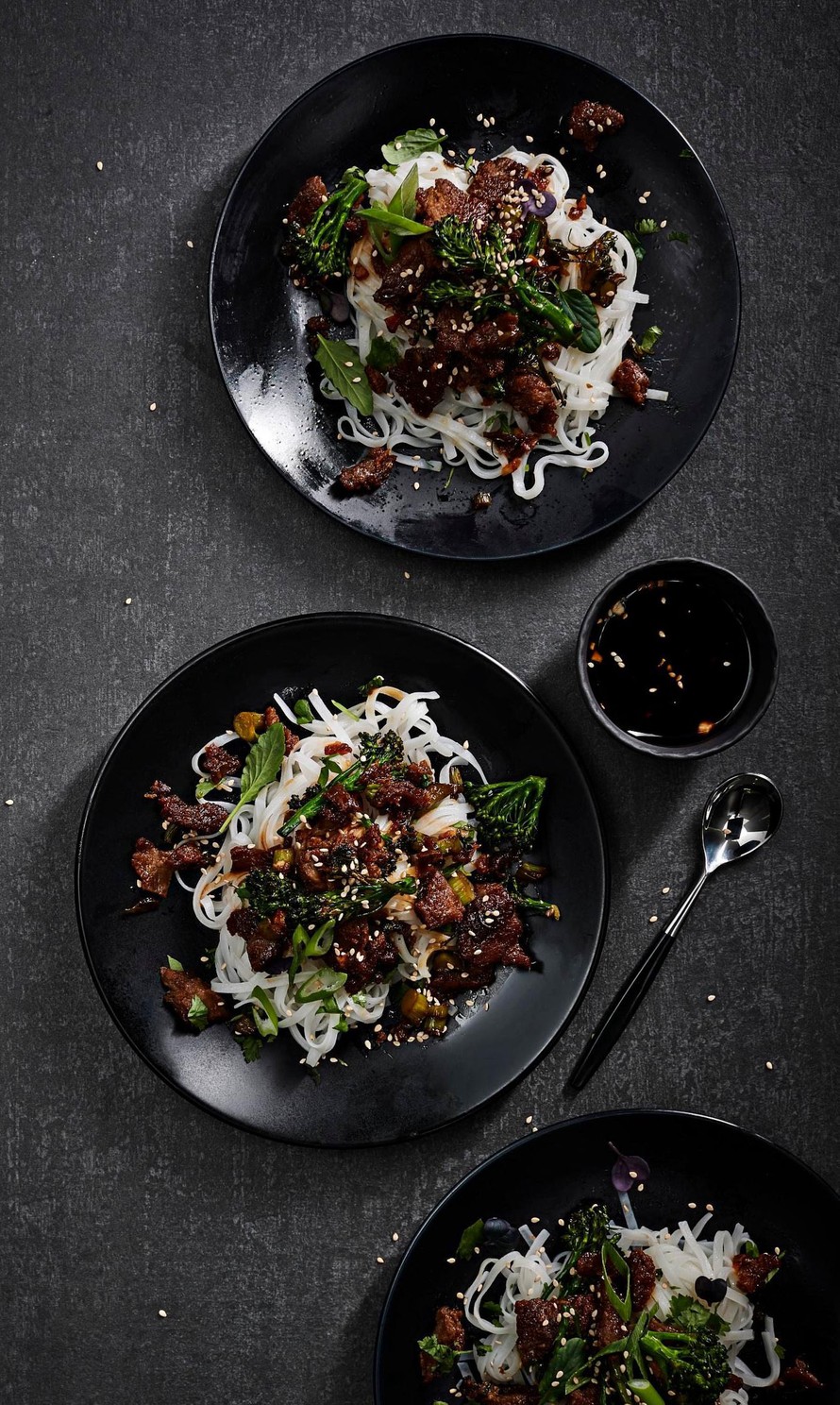 - Sekoita kastikkeen ainekset keskenään. Paista suikaleita noin 2 minuuttia kuumalla pannulla, lisää parsakaalin nuput joukkoon ja paista vielä minuutti. Kaada puolet kastikkeesta joukkoon ja kiehauta nopeasti niin, että suikaleista ja parsakaaleista tulee ihanan tahmaisia. Ripottele pinnalle seesaminsiemeniä. Tarjoa loppu kastike erikseen.