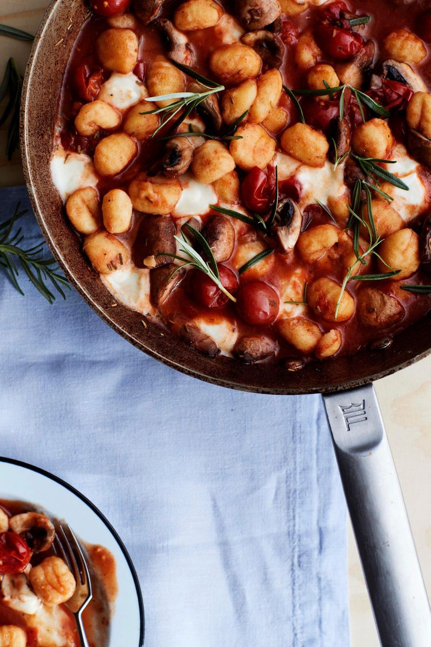 - Lisää gnocchit ja mausteet. Hauduta kastiketta 8 minuuttia. Lisää pinnalle mozzarellapallot ja jatka kypsennystä muutama minuutti.