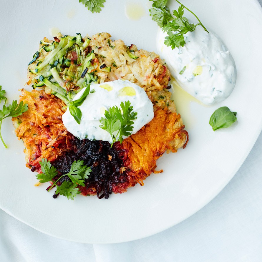 - Kuumenna öljy isossa paistinpannussa keskilämmöllä. Kumoa pihvit pannuun lastan avulla raastepuoli alaspäin. Paista 3 minuuttia. Käännä isolla lastalla varovasti ja paista puuropuolelta 1 minuutti. Tarjoa yrttijogurtin kanssa.