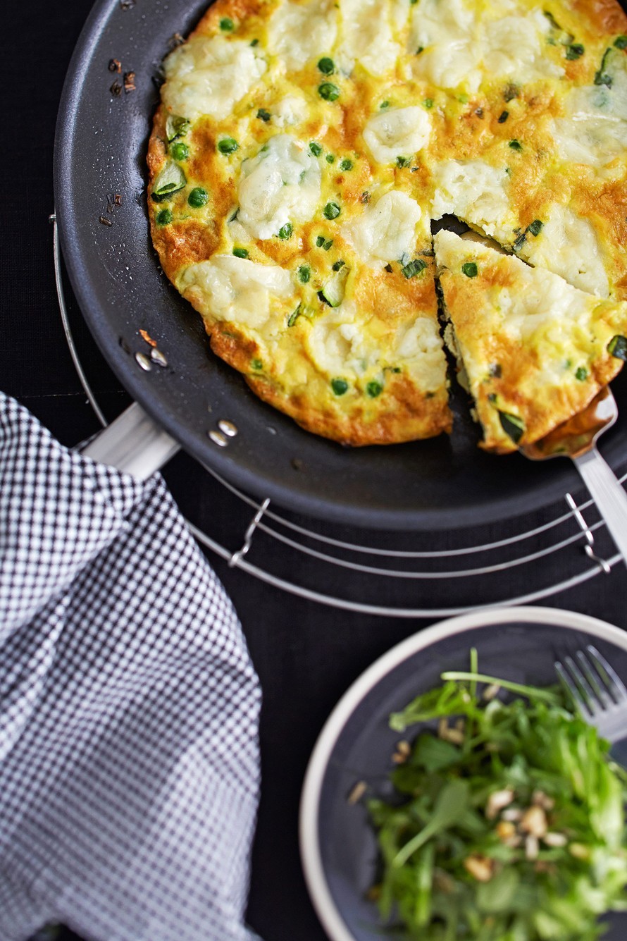 - Kuumenna öljy (uunin kestävässä) paistinpannussa, kuullota kesäkurpitsoja ja sipuleita pari minuuttia. Lisää herneet ja kaada munamassa päälle. Kypsennä noin 5–6 minuuttia kunnes munakas on hyytynyt, mutta pinnalta vielä löysää. Murustele vuohenjuusto frittatan päälle ja nosta frittata uuniin grillivastuksen alle ruskistumaan 2–3 minuutiksi tai kunnes se on kullanruskeaa päältä.