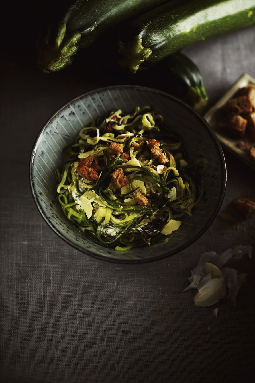 - Keitä kesäkurpitsanauhoja 3 minuuttia suolalla maustetussa vedessä (1 tl/3 l). Kaada vesi pois. Sekoita öljy ja pinaattikastike kesäkurpitsanauhojen joukkoon. Viimeistele ruoka parmesaanilastuilla ja krutongeilla.