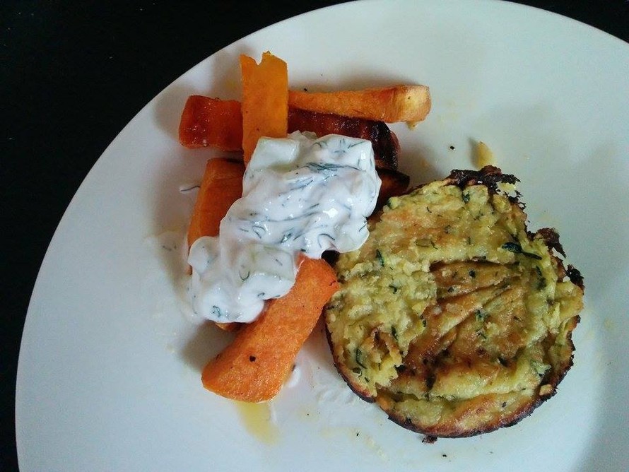 Tulin vahingossa kehitelleeksi maailman parhaan kasvispihvireseptin. Söimme juhannuksen toipumisruuaksi bataattipurilaisia, joten jääkaapissa oli feta-turkkilainenjugurttimössöä sekä epämääräisiä bataatin päätykimpaleita. Bataateista leikatuista lankuista tuli uunissa suolaisille pihveille herkullinen lisuke. Lisäksi kurkkusalaatti sopi kokonaisuuteen kuin nenä päähän.