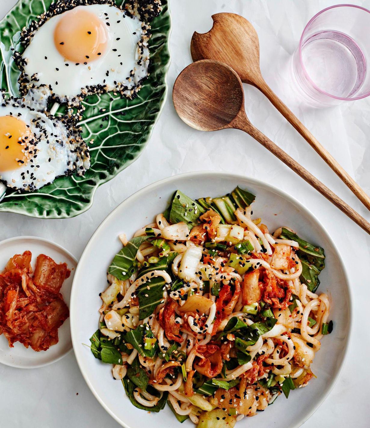 Tarjoa kimchinuudelit paistettujen kananmunien kanssa. Ripottele pannuun jääneet seesaminsiemenet annosten pinnalle.