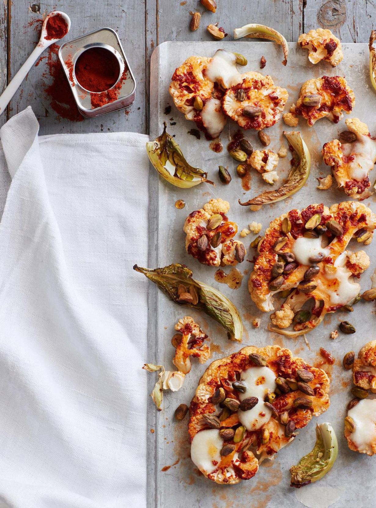 - Levitä viipaleet ja murentunut kukkakaali sekä lehdet uunipellille leivinpaperin päälle.