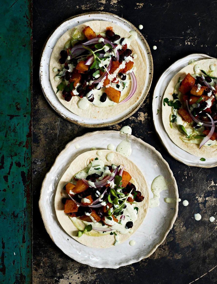 Lämmitä tortillaletut ja tarjoa korianterijogurtin, kurpitsa-papuseoksen ja punasipulin kera.