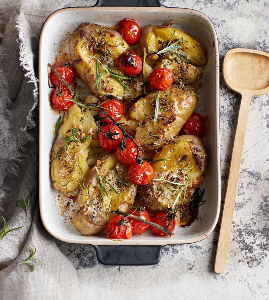 - Paahda perunoita uunissa noin 20 minuuttia, kunnes pinta saa väriä. Silppua päälle tuoretta rosmariinia.