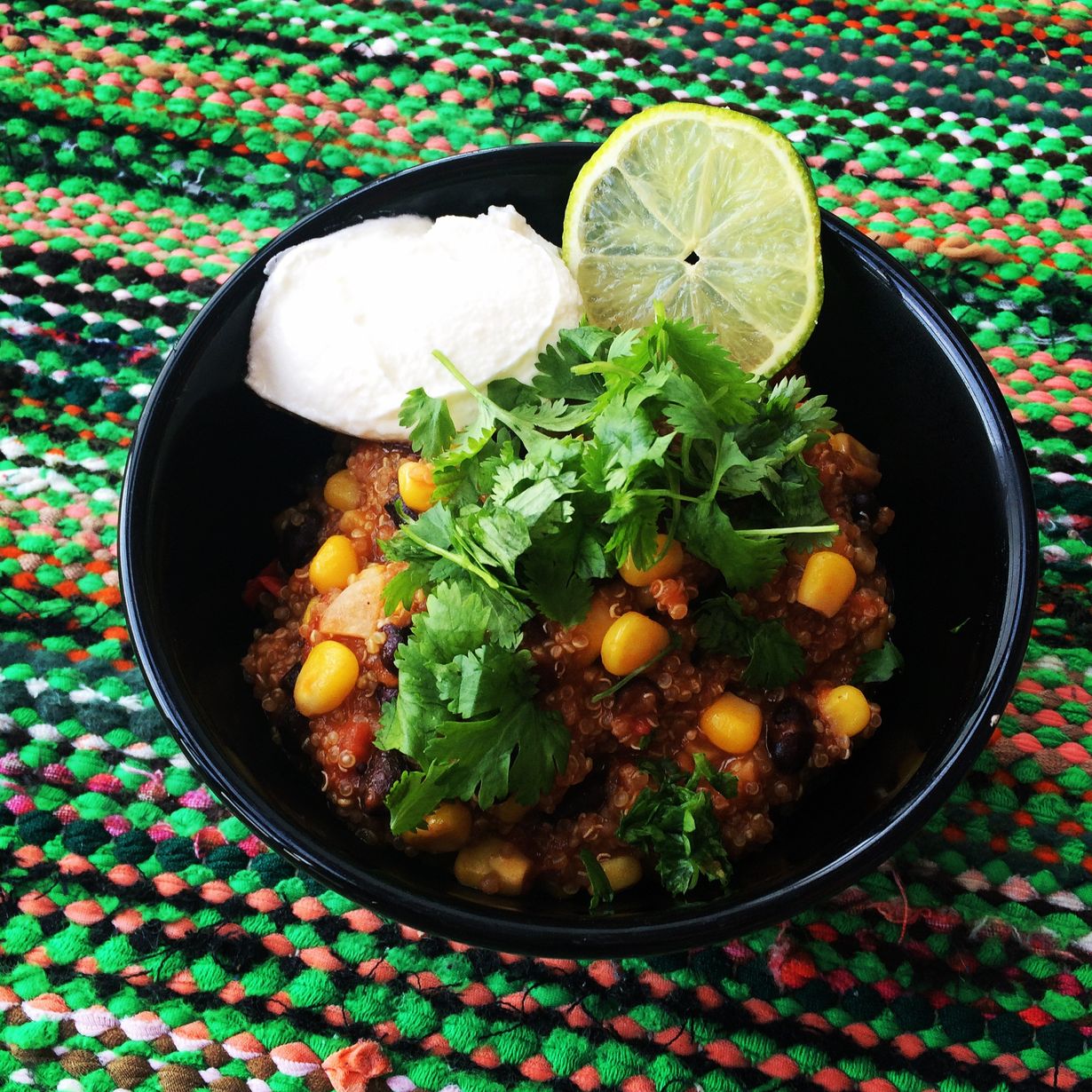 Meksikolaisen kvinoapannun kohdalla nälkää ei tarvitse pelätä. Kvinoa on jo itsessään aika tuhtia, ja kun siihen sekoittaa mustia papuja ja maissia, vastaa ruoka täyttävyydeltään melkein burritoa. Tosin kvinoalla taitaa olla riisiä paremmat ravintoarvot.