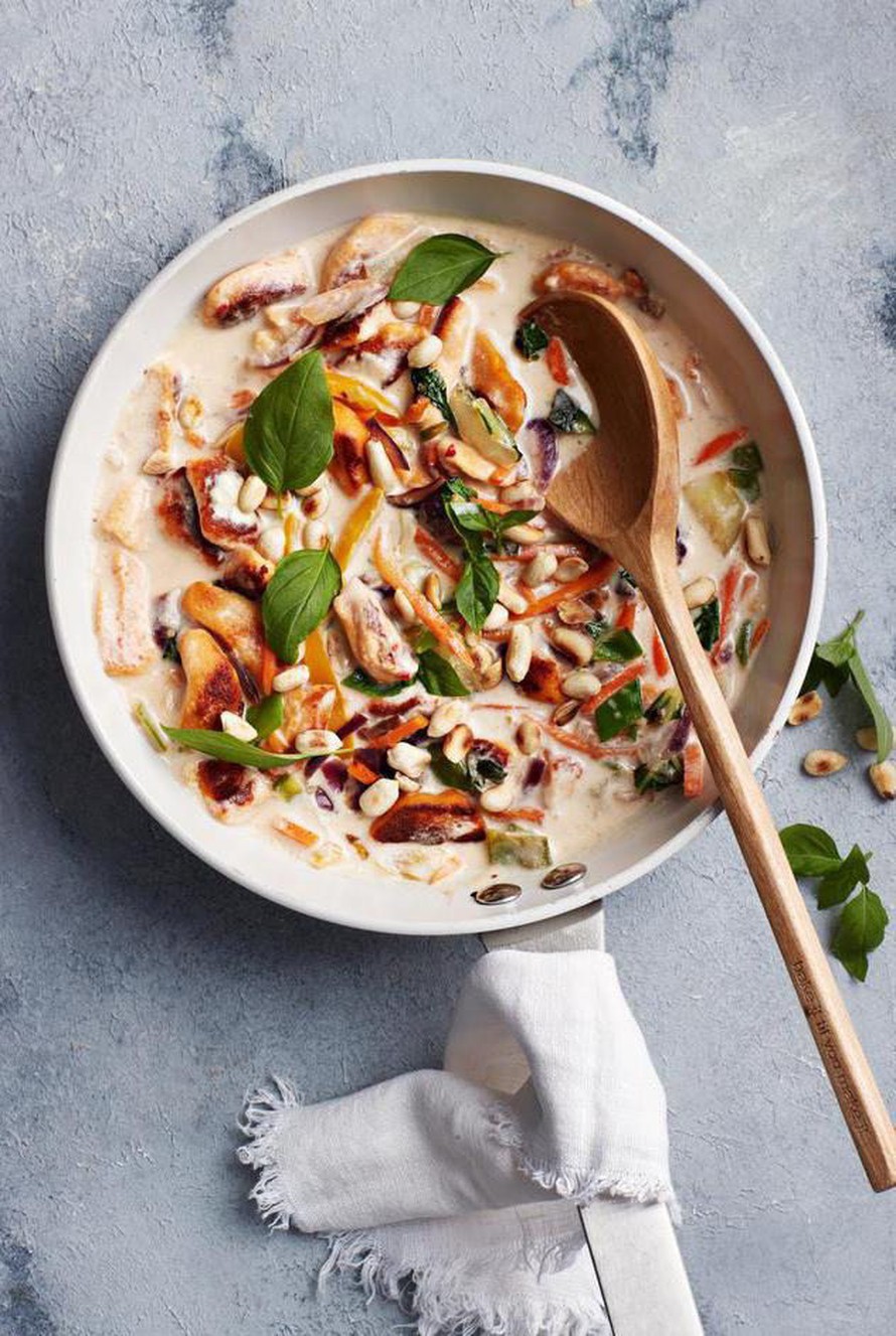 - Ripottele pinnalle pähkinöitä ja halutessasi thaibasilikaa.