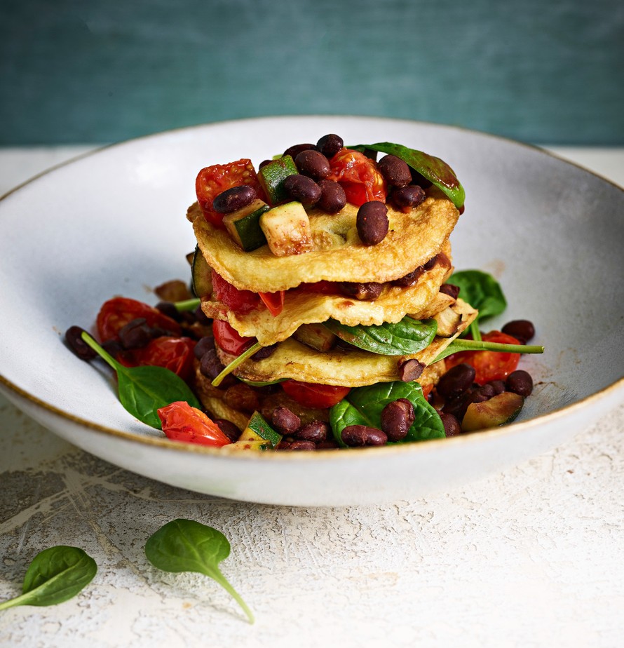 Paista munakasmassasta pieniä lettusia. Syö letut kuumina kasvis-papumuhennoksen kanssa.
