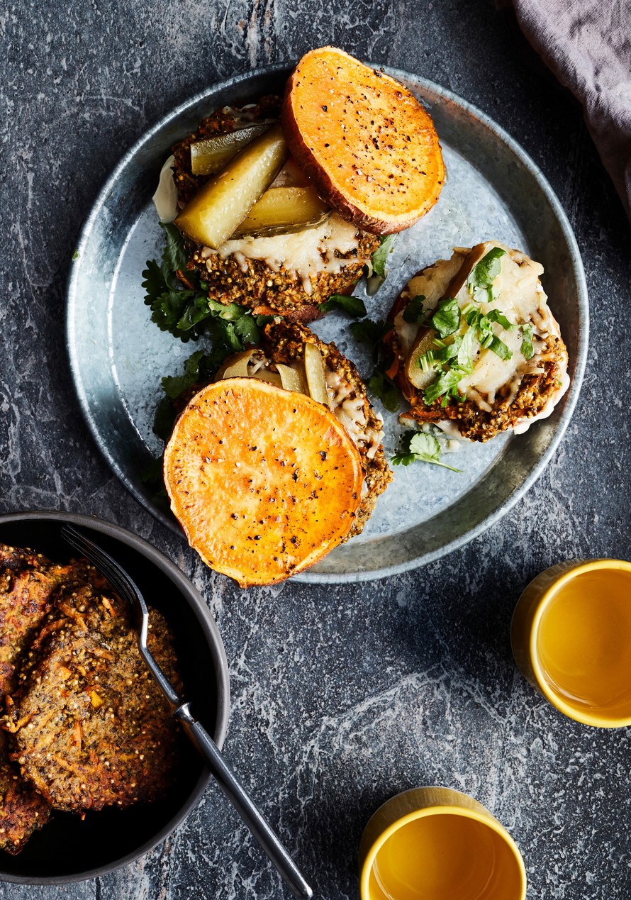 Pihvit maistuvat bataattisiivujen välissä burgerin tapaan. Kypsennä uunissa ja täytä majoneesilla, juustolla, korianterilla ja maustekurkulla.