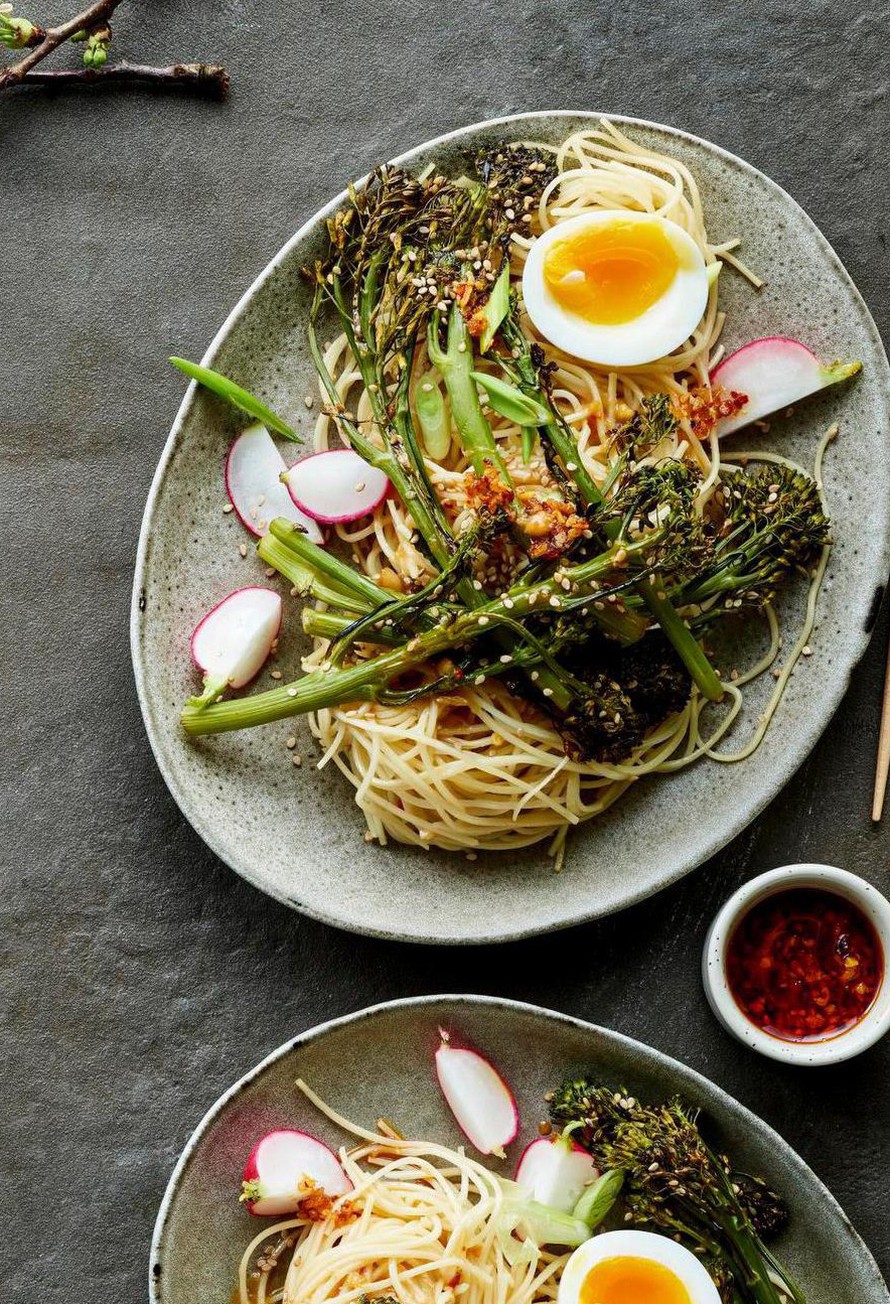 Jaa nuudelit kulhoihin ja laita päälle parsakaalia, retiisiä ja kananmunaa ja halutessasi lisää rapeaa valkosipulia tai chiliä. Voit myös puristaa päälle limetin mehua.