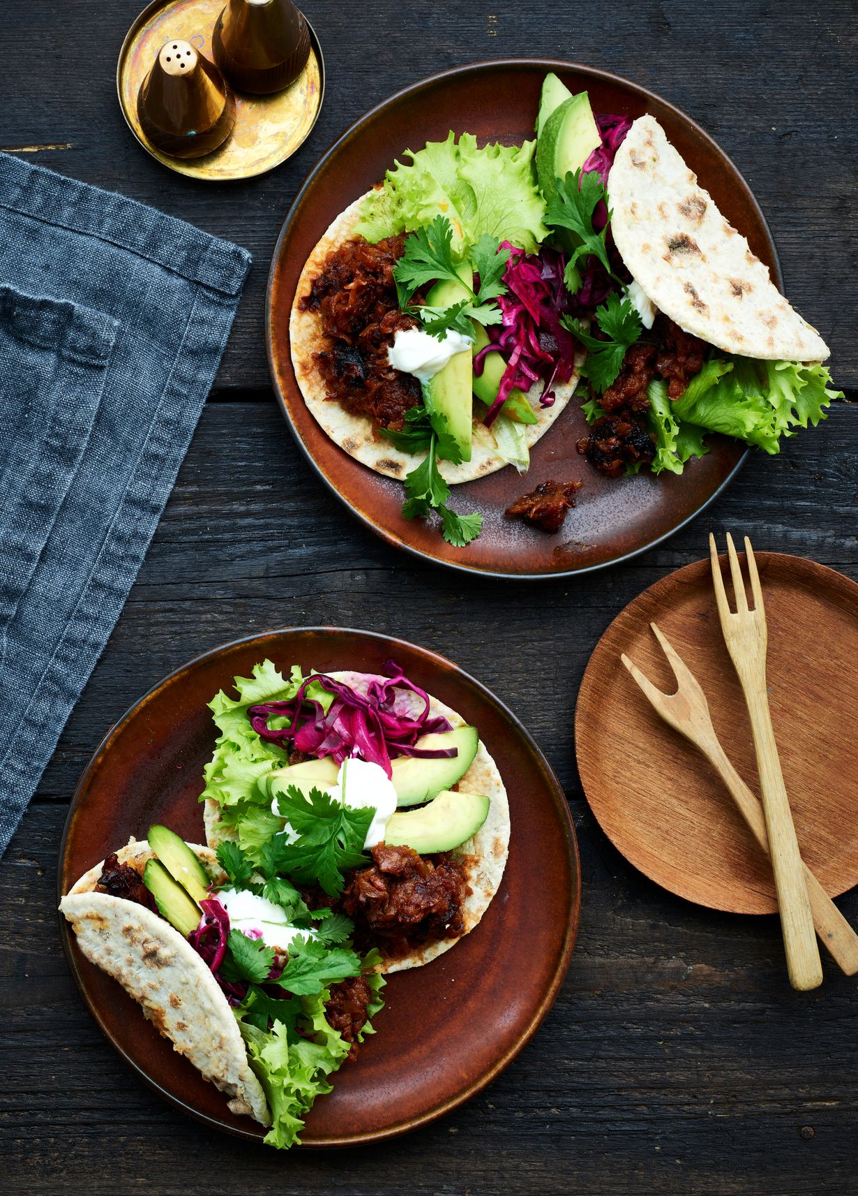 Halkaise avokadot, poista kivi ja kuori, viipaloi hedelmä. Lämmitä rieskat ja täytä ne nyhtösellerillä, kaalisalaatilla, avokadolla, salaatinlehdillä ja korianterilla. Viimeistele ranskankermalla.