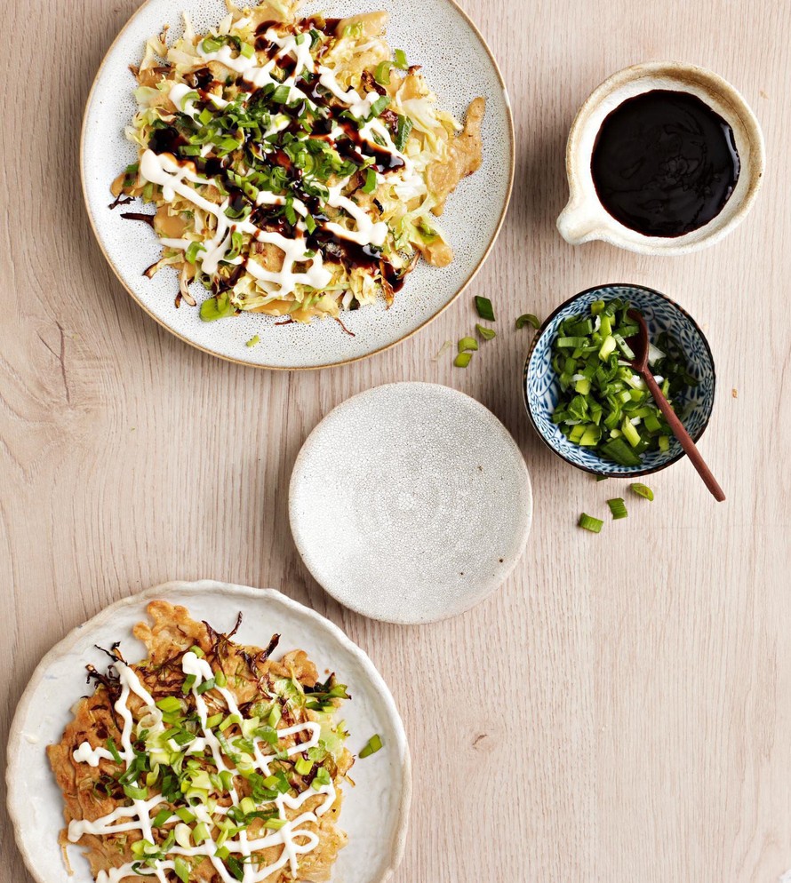 Tarjoa okonomiyaki kevät- tai ruohosipulin, majoneesin ja kastikkeen kanssa.
