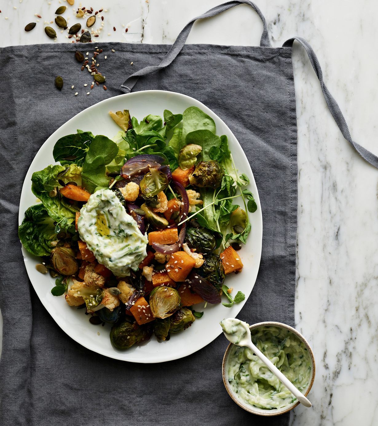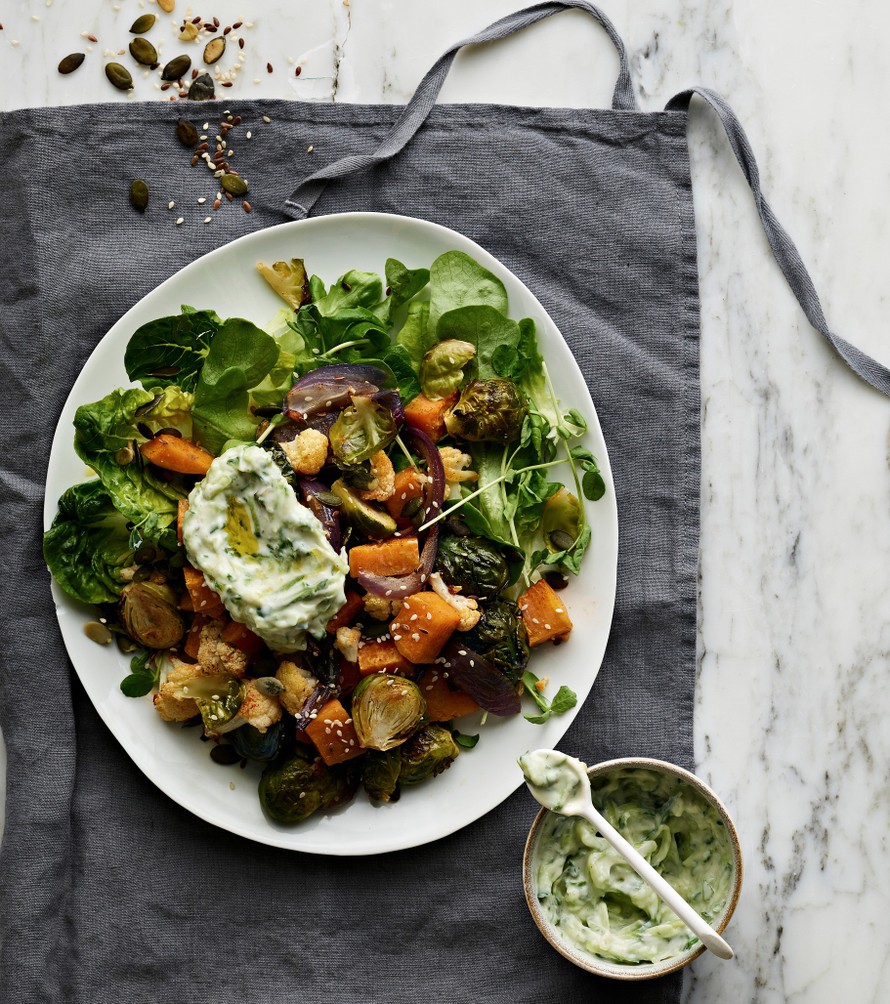 Laita uuni kuumenemaan 200 asteeseen. Kuori bataatti ja punasipuli, ja leikkaa ne kukkakaalin kanssa sopiviksi suupaloiksi. Leikkaa ruusukaalit puoliksi. Laita kasvikset uunipellille ja sekoita joukkoon öljy ja mausteet. Paahda uunissa noin 20 minuuttia. Anna jäähtyä.