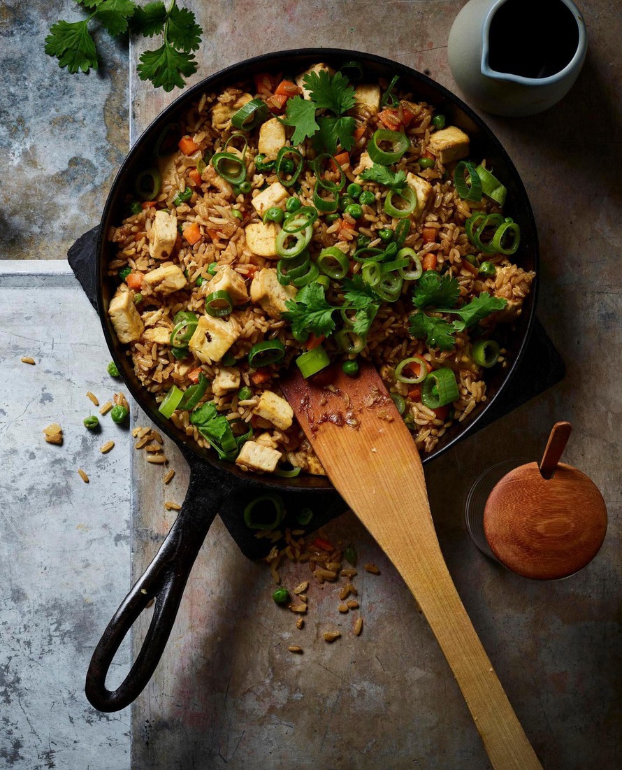 Nosta lämpötilaa ja lisää riisi ja herneet. Paista riisiä kuumalla pannulla, älä pelkästään lämmitä, varo polttamasta. Sekoita paistamisen aikana. Lisää lopuksi paistettu tofu.