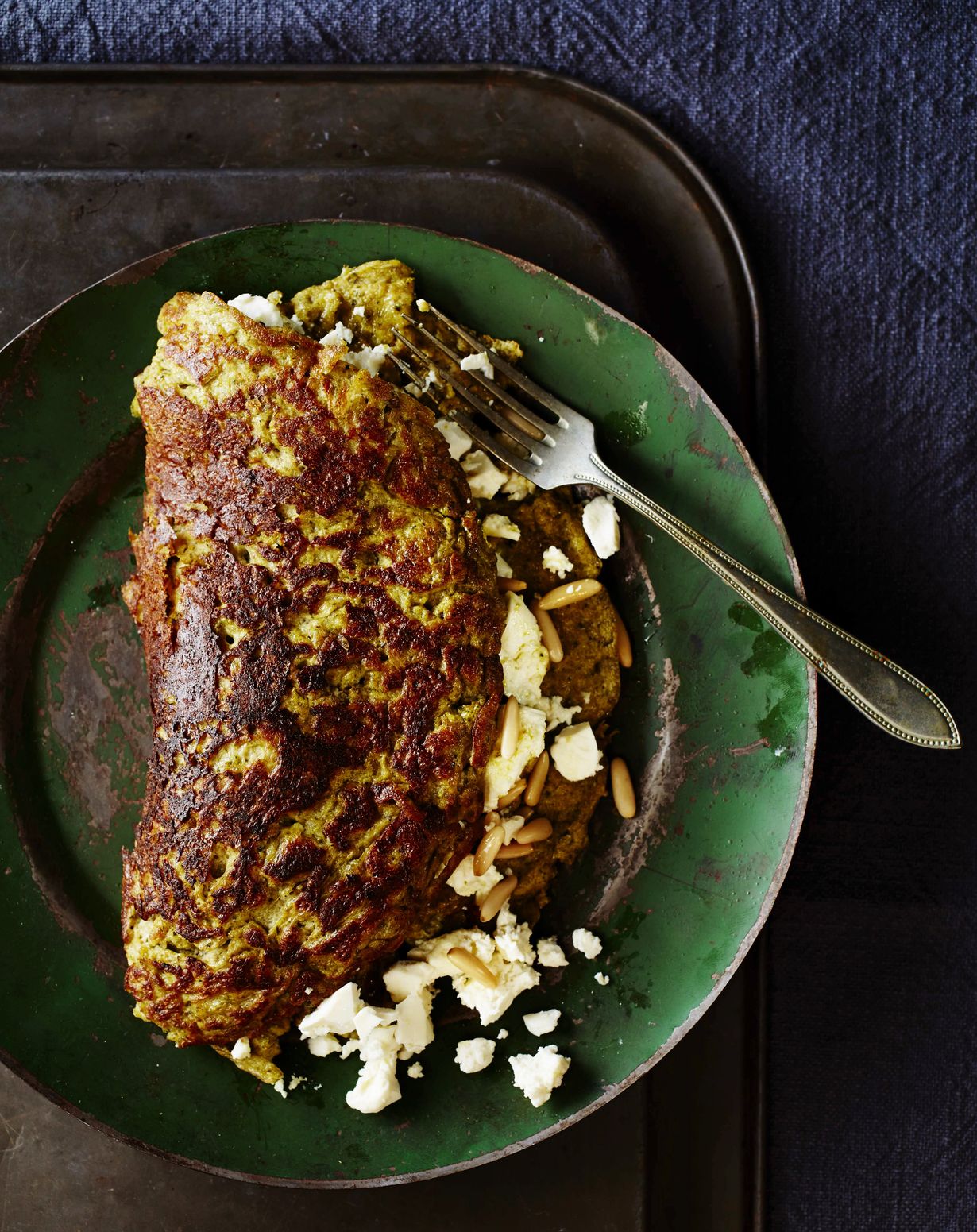 - Murusta feta munakkaan päälle ja ripottele pinjan siemeniä fetan päälle. Käännä munakas lastalla kaksinkerroin ja tarjoa.