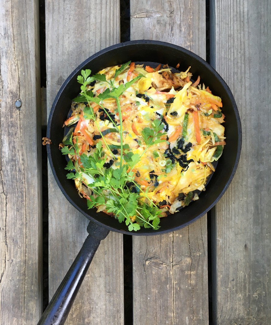 Muutamalla aineksella munakas muuntuu japanilaisen okonomiyakin pikaversioksi. Napakoiksi paistetut kasvissuikaleet ja misotahna antavat munakkaaseen herkullisen maun.