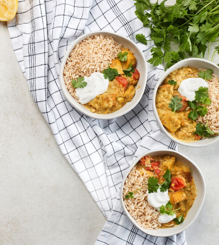 Sekoita noin 2/3 ranskankermasta curryn joukkoon ja palauta samalla tofukuutiot pannulle. Kuumenna ja mausta lopuksi sitruunamehulla ja hienonnetulla korianterilla. Tarjoa loppu ranskankerma lusikoituna annosten päälle.
