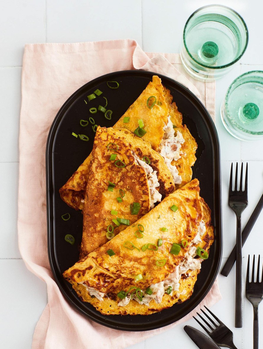 Paista letut isolla pannulla voissa molemmin puolin kypsiksi. Täytä sienimuhennoksella. Hienonna päälle kevätsipulia.
