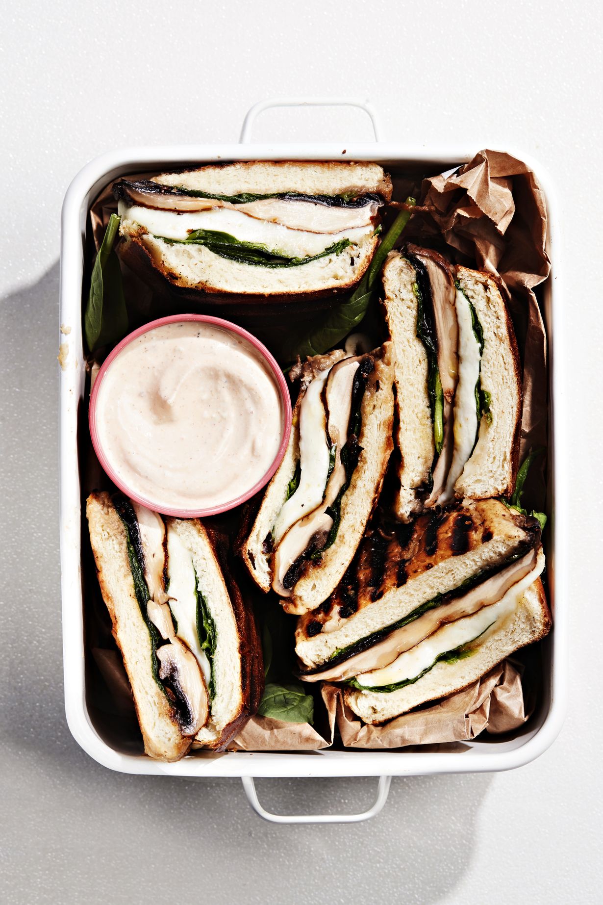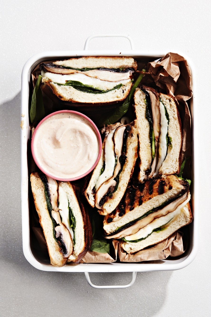 Rapeapintaisiksi pariloidut briossisämpylät kätkevät sisälleen muhevan täytteen: harissamarinadilla maustettua, pikaisesti paistettua portobellosientä, mozzarellaa ja pinaattia.