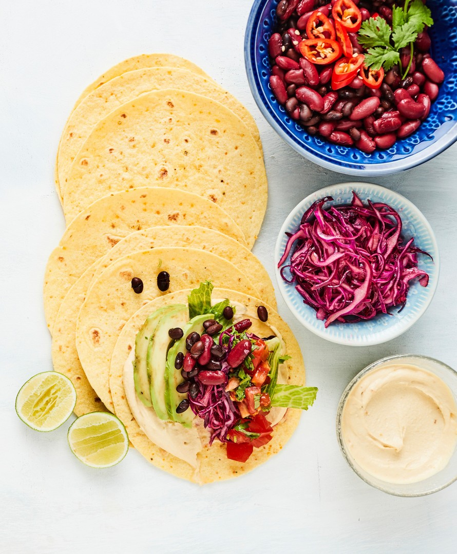 Kääräise tortillaletun sisään marinoitua punakaalta, avokadoa ja papupaistosta. Erilaiset lisukkeet, täytteet ja tahnat tuovat makua ja väriä fajitas-pöytään.