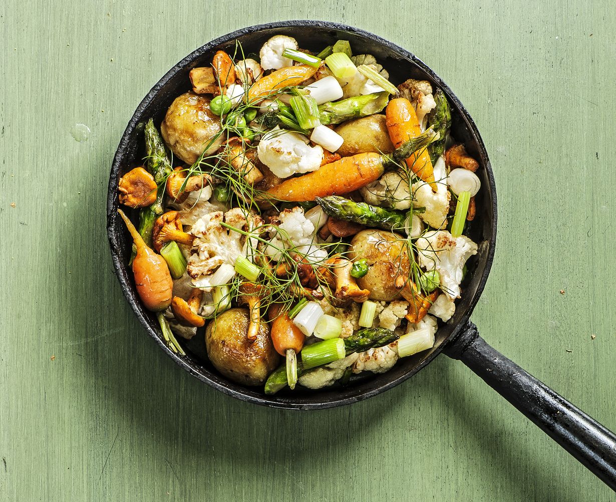 - Kuumenna öljy kookkaassa paistinpannussa tai vokissa. Lisää kukkakaali, perunat ja porkkanat. Paista sekoitellen noin 10 minuuttia. Lisää sipuli, sienet ja parsapalat. Mausta suolalla tai soijakastikkeella ja pippurilla. Hienonna yrtit sekaan.