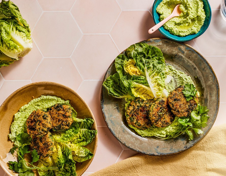 Muotoile pihvit kostutetuin käsin ja paista öljyssä keskilämmöllä noin 2 minuuttia per puoli. Tarjoa lämpiminä edamame-hummuksen ja raikkaan salaatin kanssa.