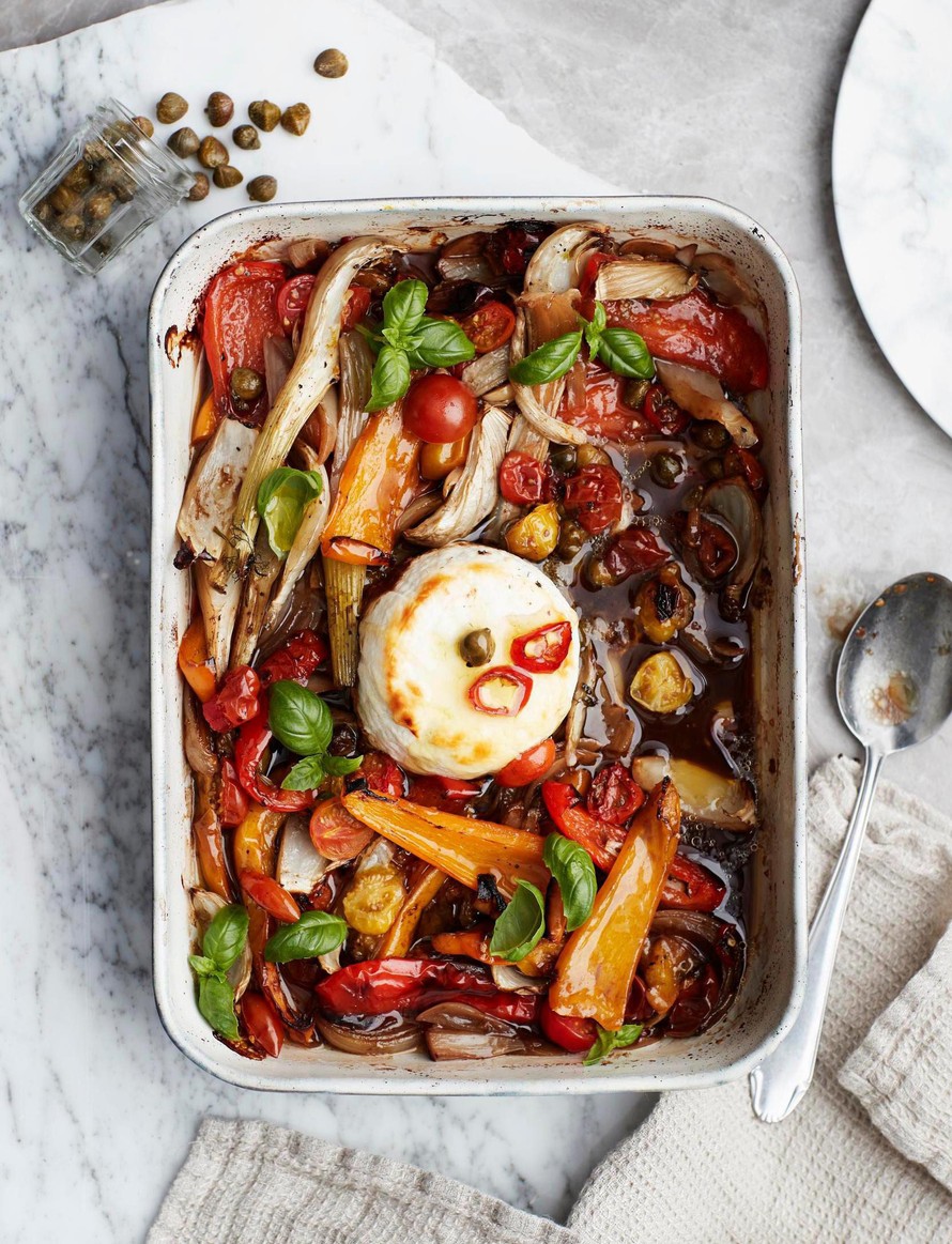 Uunissa kypsyvä ricotta-kasvispannu pelastaa arjen ja sunnuntain. Tarjoa sen kanssa pastaa tai pyyhi ihanat maut talteen vaalealla maalaisleivällä.