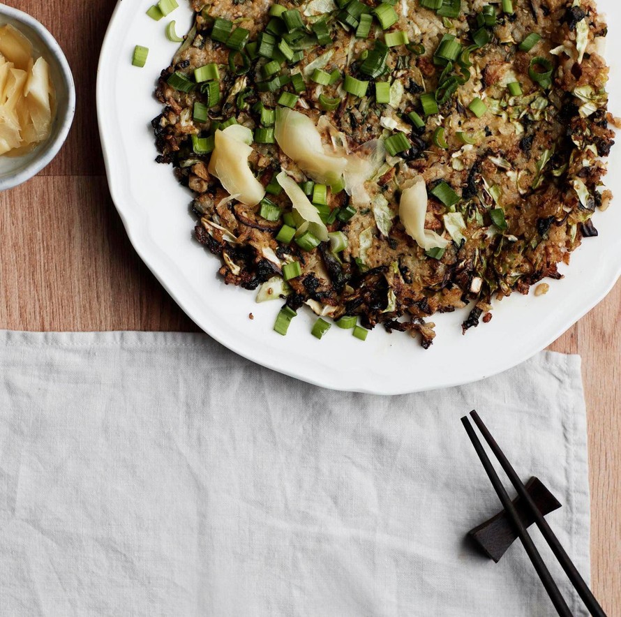 Kuumenna pinnoitettu paistinpannu keskilämmöllä ja lisää 1 rkl seesamiöljyä. Kumoa puolet taikinasta pannulle ja tasoita lastalla paksuksi letuksi. Paista miedolla lämmöllä molemmin puolin noin 5 minuuttia. Lisää seesamiöljyä, kun käännät letun. Paista loput taikinasta samoin. Tarjoa lisäksi garia eli sushi-inkivääriä.