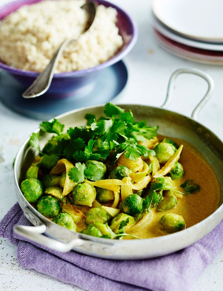 - Lisää kookosmaito ja kuumenna se kiehuvaksi. Lisää ruusukaalit ja keitä niitä 4-5 minuuttia, kunnes ne ovat kypsiä.