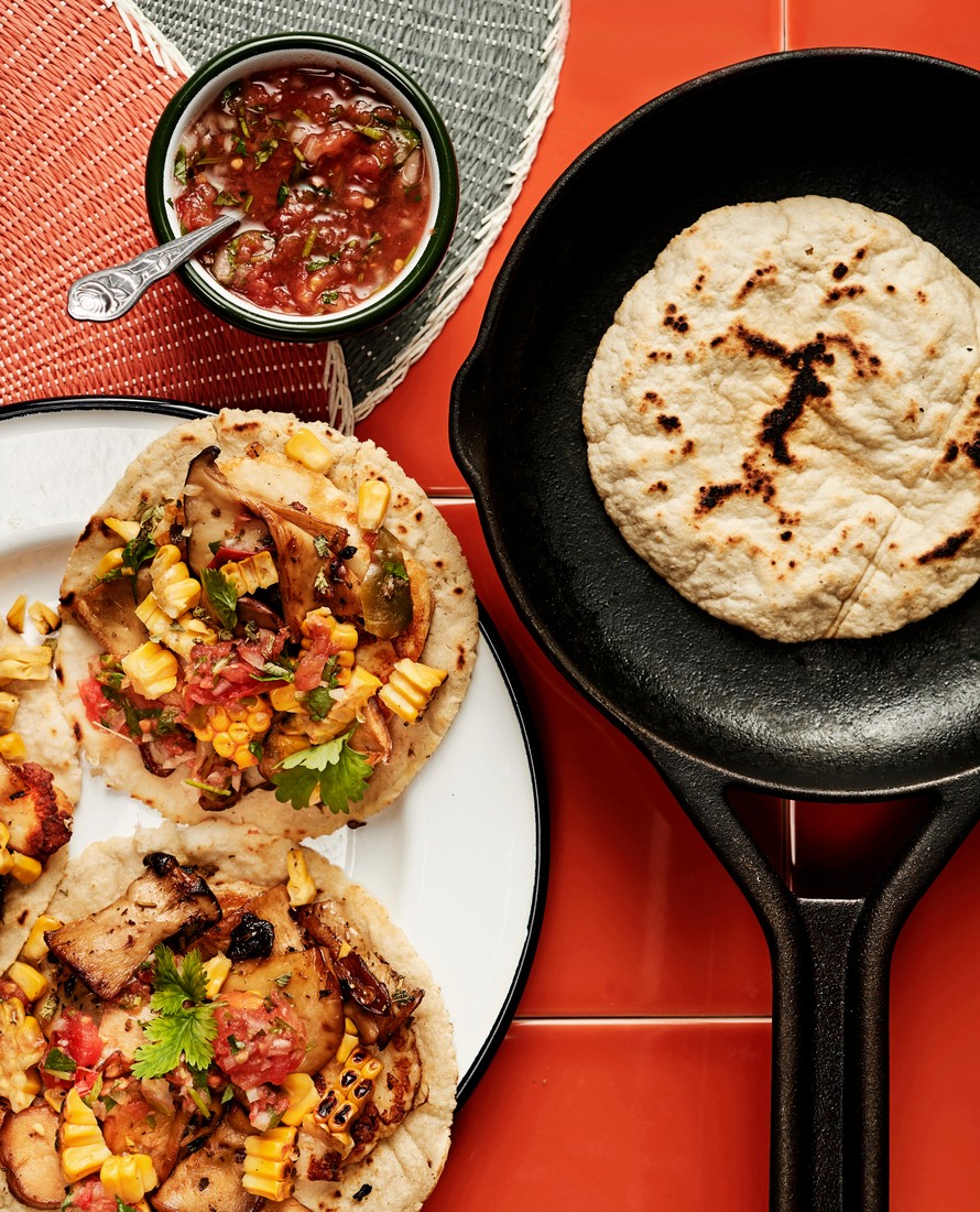 Levitä lämpimille tacoille ensin kuumat halloumit, lisää sitten sienet ja maissi. Annostele päälle paahdettua tomaattisalsaa ja hienonnettua korianteria. Tarjoa heti.