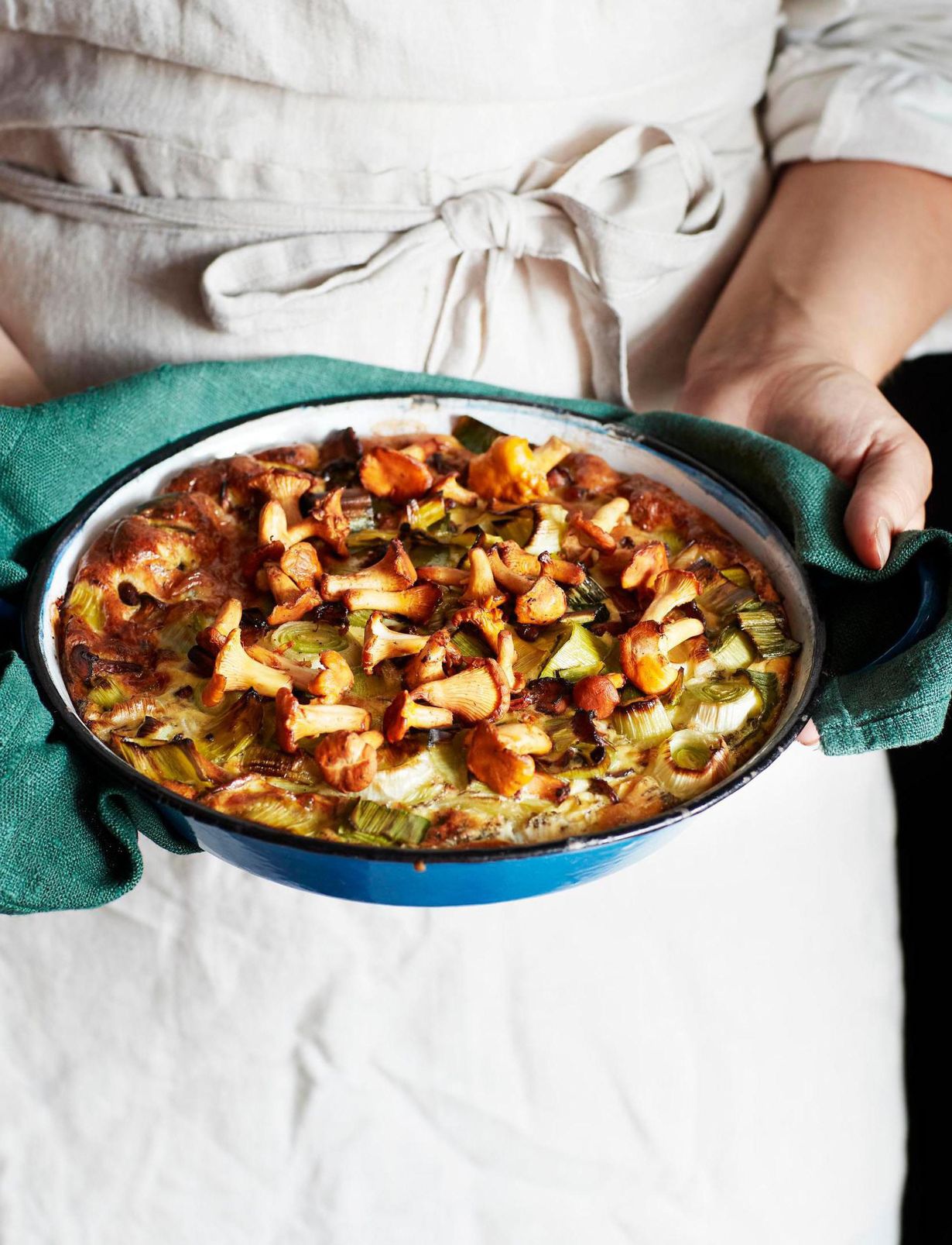 Valitse paistamiseen uuninkestävä pannu. Paista sieniä ensin kuivalla pannulla noin 5 minuuttia, kunnes suurin osa nesteestä on haihtunut. Lisää öljy, purjo ja timjami. Jatka paistamista keskilämmöllä noin 5 minuuttia tai kunnes purjo on kypsää. Ota pannu pois liedeltä.
