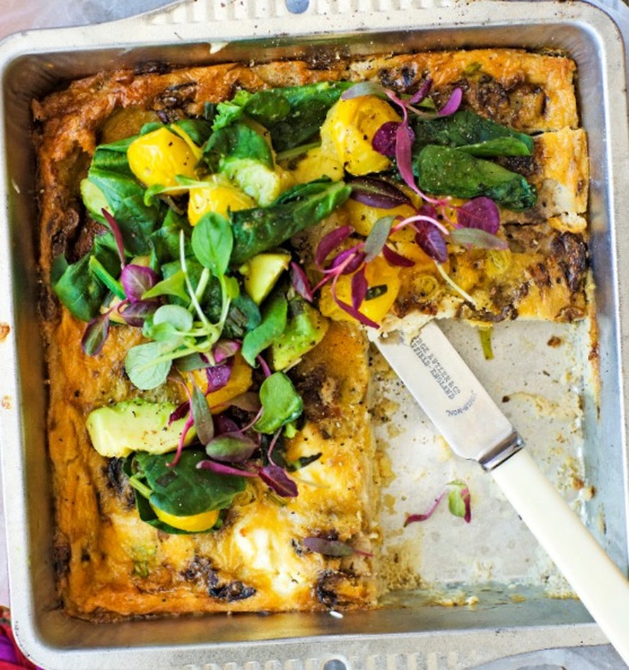 - Nosta vuoka uunin keskitasolle 150 asteeseen ja kypsennä noin 20 minuuttia, tai kunnes munamassa on kokonaan hyytynyt. Juuri ennen tarjoilua kääntele pannulla pienessä öljytilkassa silputut kevätsipulinvarret ja halkaistut kirsikkatomaatit lämpimiksi.