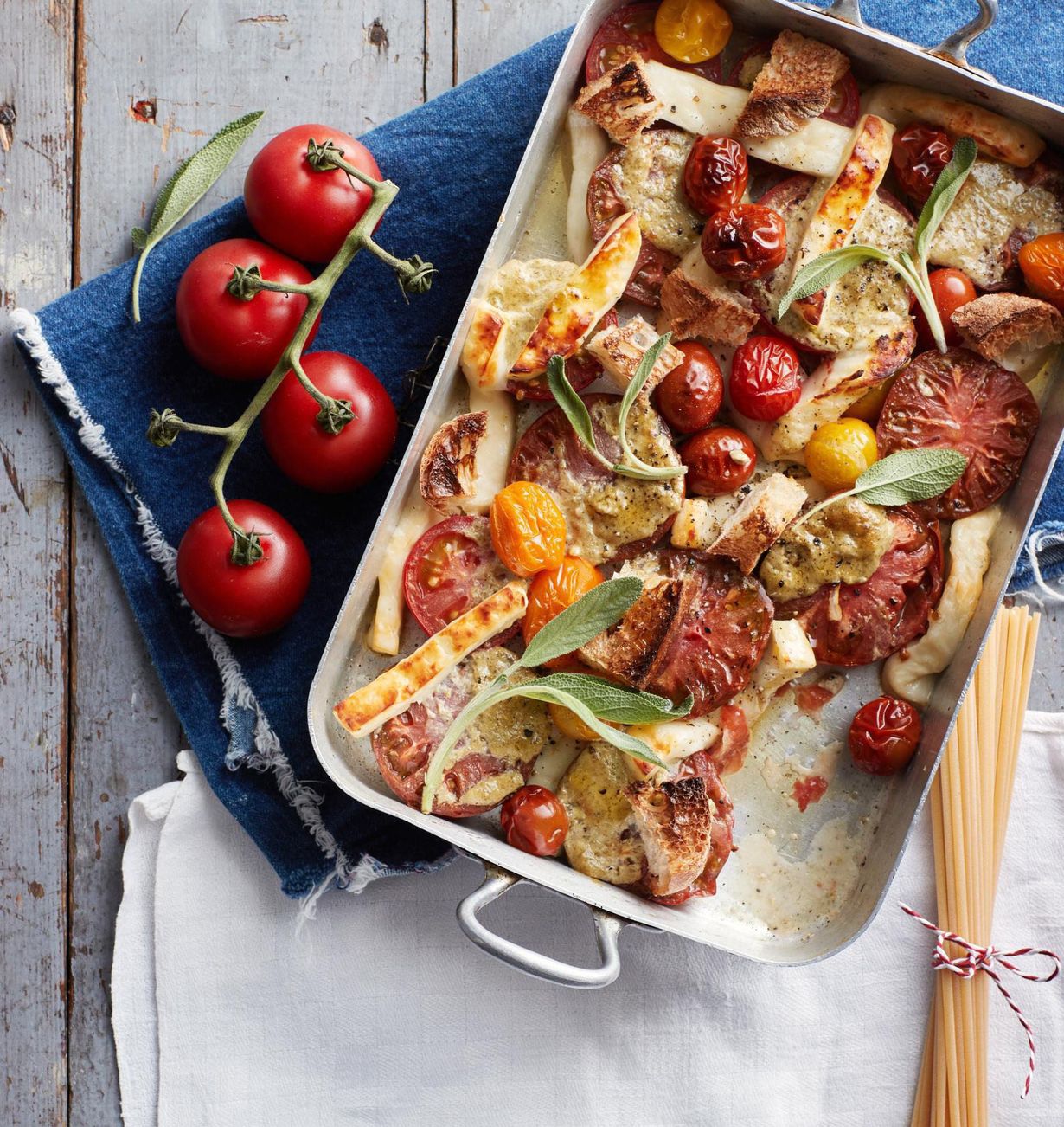 3. Lado tomaatit ja halloumi vuokaan. Levitä tomaateille salviapestoa.
