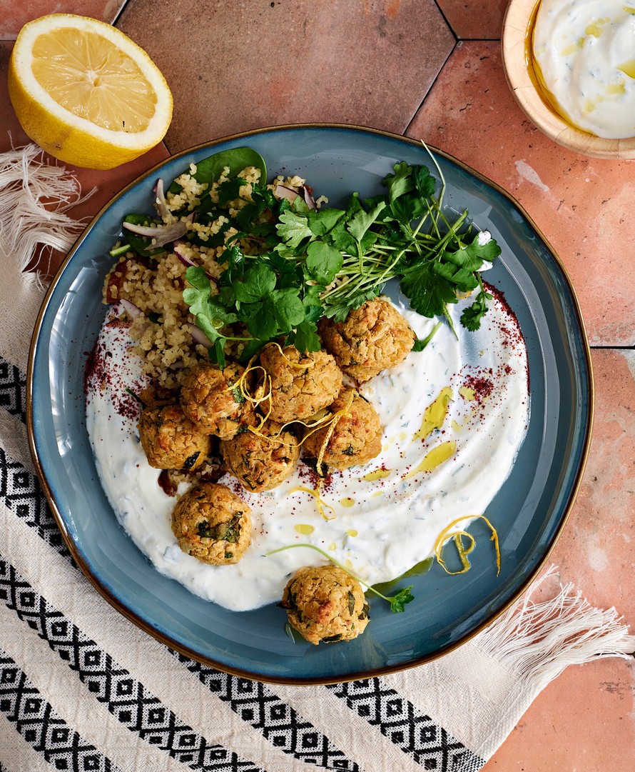 Tarjoa kuumat falafelit kuskussalaatin, jogurttikastikkeen ja tuoreen lehtipersiljan kanssa. Ripottele halutessasi annoksen päälle sumac-mausteseosta.