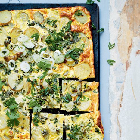 4. Hienonna lehtipersilja ja ripottele paahtuneiden perunoiden päälle. Lisää sipulinvarret ja kaprikset. Kaada päälle munakasseos. Jatka kypsentämistä 200-asteisen uunin keskitasolla noin 20 minuuttia.