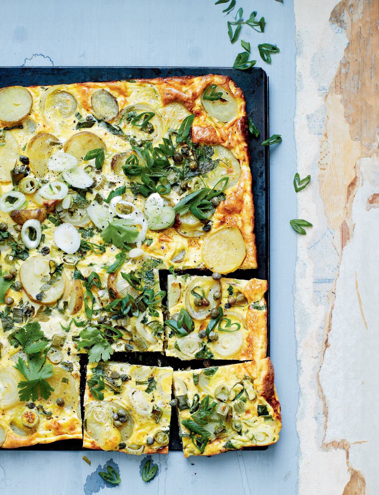 - Hienonna lehtipersilja ja ripottele paahtuneiden perunoiden päälle. Lisää sipulinvarret ja kaprikset. Kaada päälle munakasseos. Jatka kypsentämistä 200-asteisen uunin keskitasolla noin 20 minuuttia.