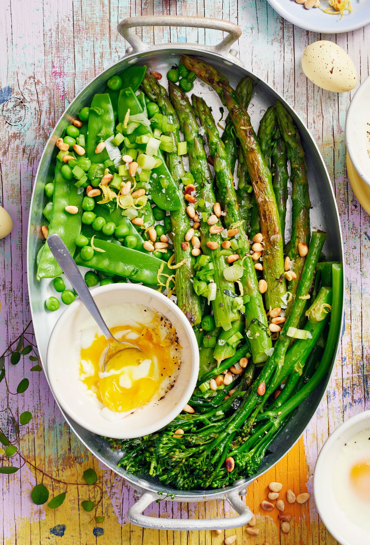 Sitruunaiset kasvikset muuttuvat ateriaksi, kun tarjoat niiden kanssa uunimunia. Rapeutta keväinen annos saa paahdetuista pinjansiemenistä.