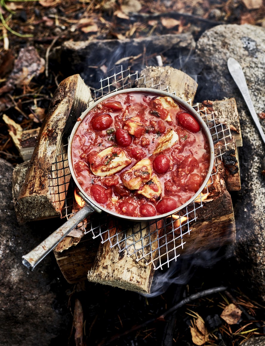 Helppo halloumi-tomaattipannu onnistuu vaikka retkellä. Tarjoa se bulgurin, ohran tai vaikka hyvän leivän kanssa.