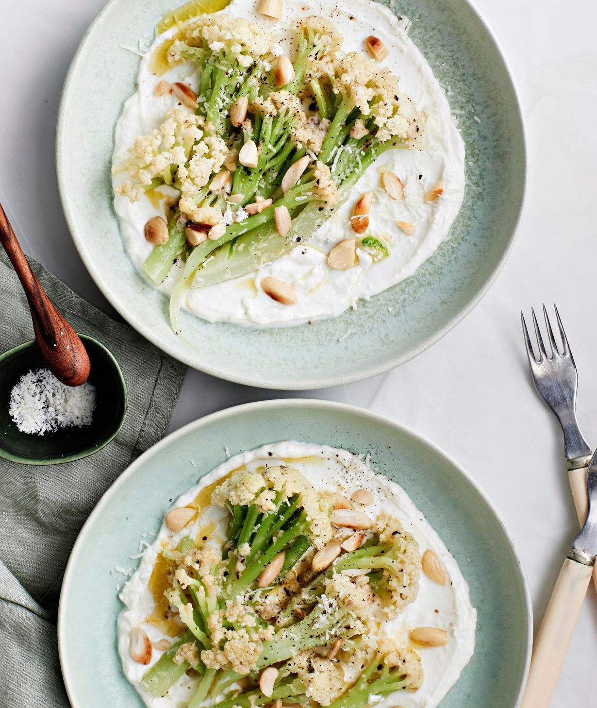 6. Levitä rahka lautaselle ja asettele varsikukkakaalit päälle. Viimeistele mantelirouheella.