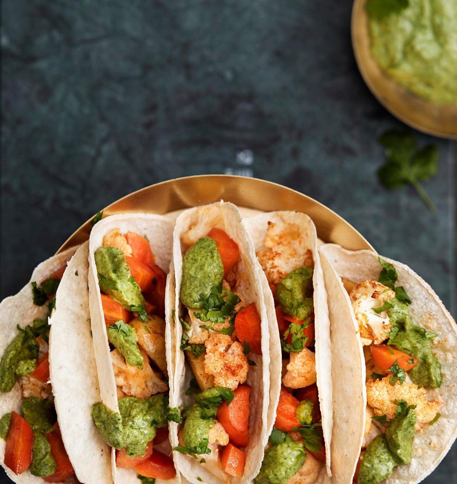 Perunaa tacojen täytteeksi? Kyllä vain! Suuta kuumotteleva raikas yrttikastike tuo potkua paahdettuihin kasviksiin.