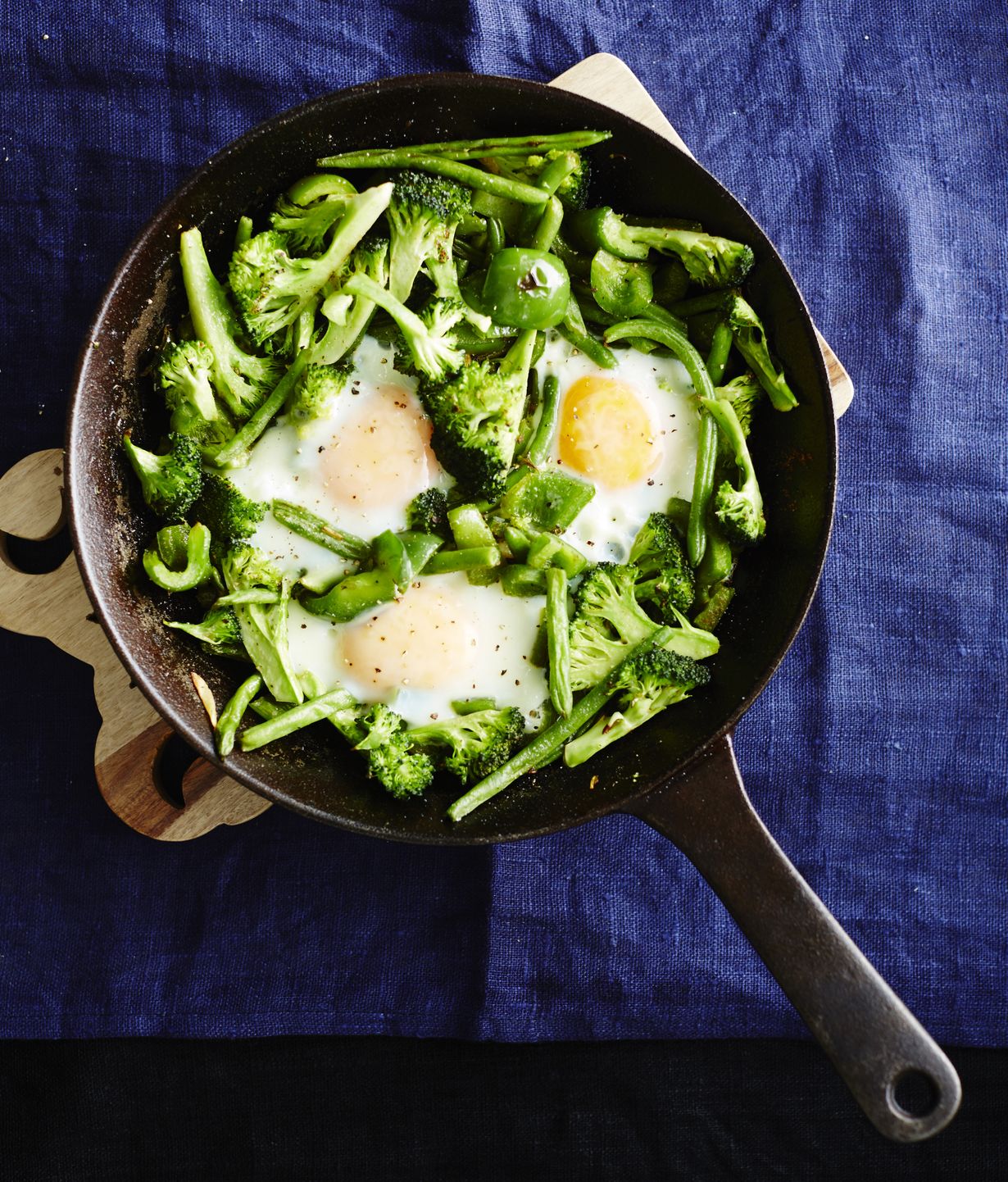 Vihreät kasvikset paistetaan pannussa rapsakoiksi ja joukkoon rikotaan pari munaa. Helppo arkiruoka on nopea ja edullinen.