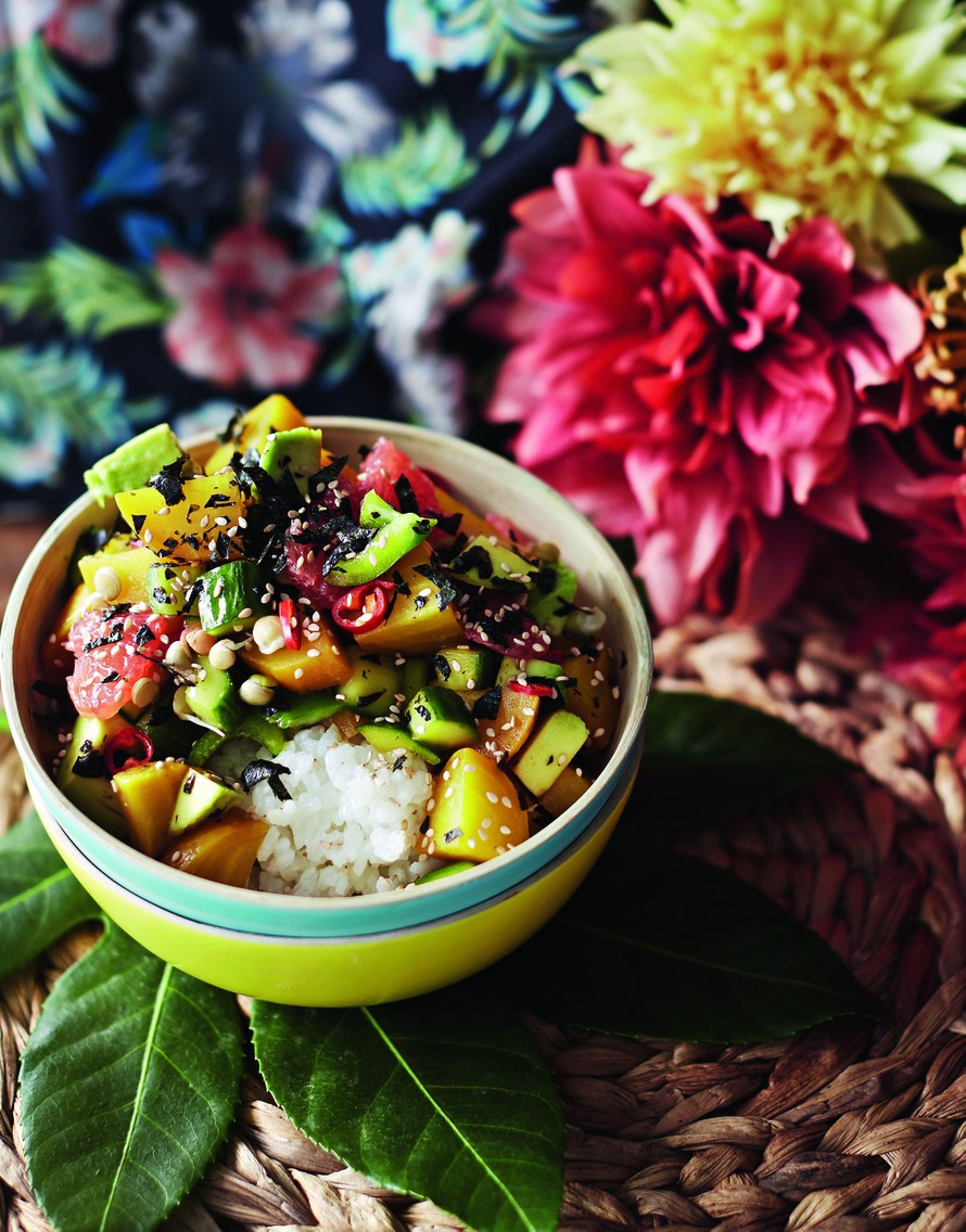- Hienonna norilevy muruksi veitsellä. Jaa riisi neljään kulhoon ja nosta marinoidut vihannekset päälle. Viimeistele norilevyn paloilla.
