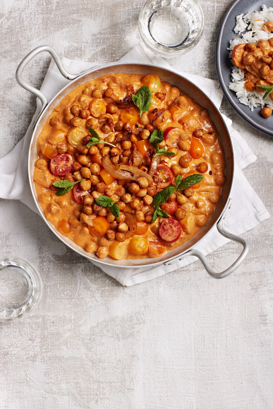 - Ripottele muhennoksen pinnalle syrjään ottamasi paistetut kikherneet, tomaatit ja minttu.