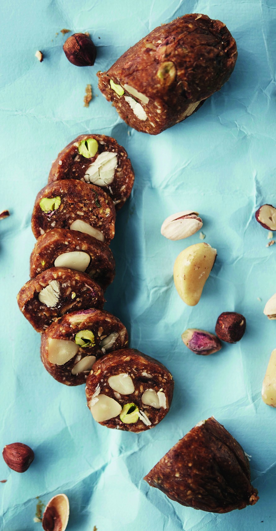 Levitä tahna leivinpaperille noin 15 cm pituiseksi ja 10 cm levyiseksi levyksi. Levitä parapähkinät ja pistaasipähkinät levyn päälle. Rullaa pötköksi paperin avulla. Sulje rulla päistään kuin karkkipötkö. Anna kovettua jääkaapissa ainakin tunti ennen tarjoilua.