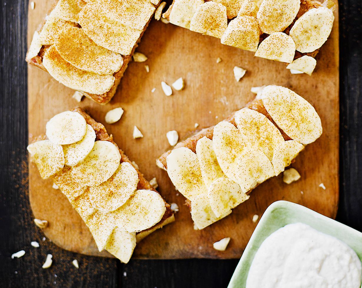 - Viipaloi banaani piiraan pinnalle. Tee kastike jauhamalla cashewpähkinät monitoimikoneessa veden ja hunajan kanssa. Tarjoa kastike piiraan lisukkeena.