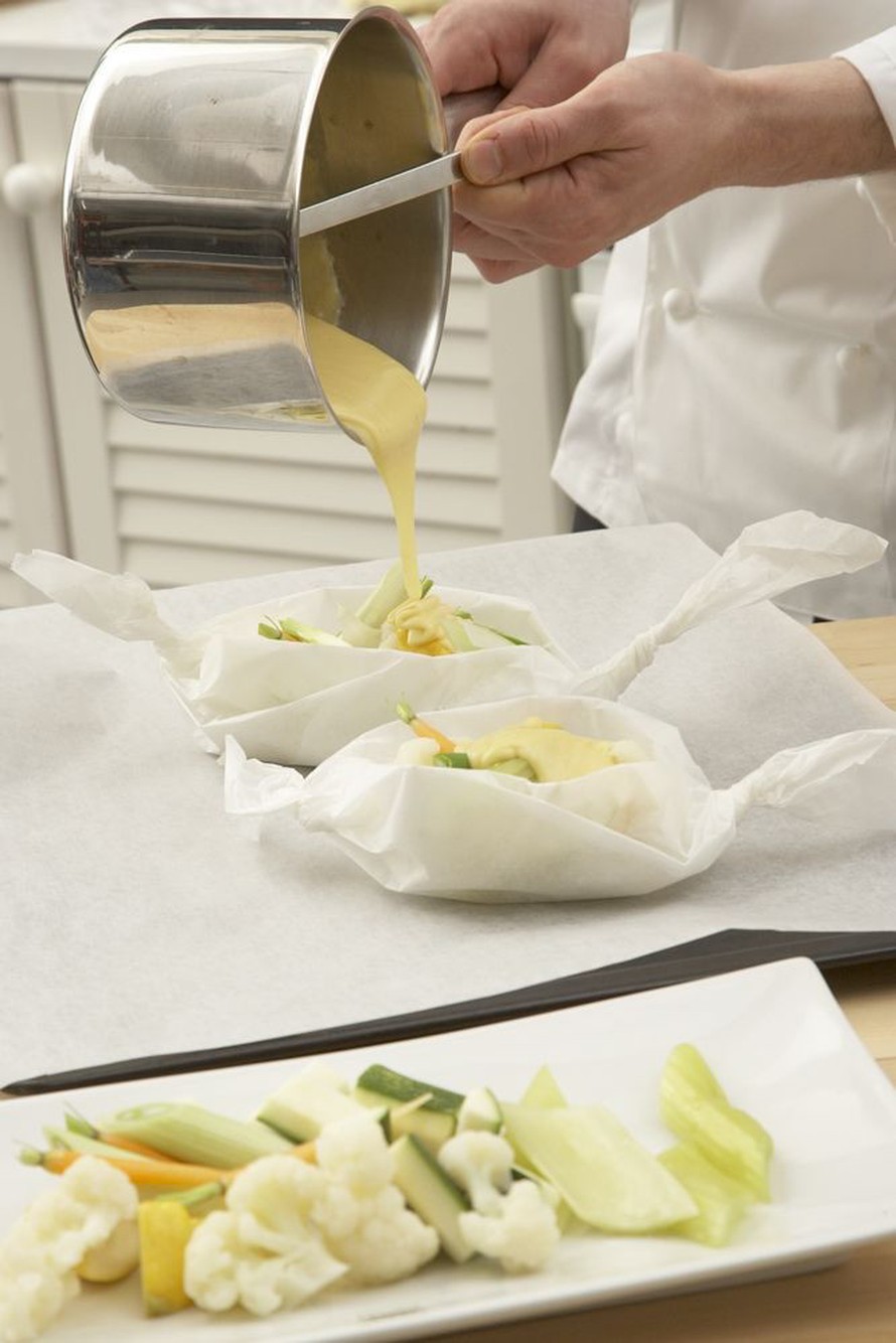 Jaa kasvikset neljälle SAGA Leivinpaperiarkille. Tee arkeista 'SAGA vene' kiertämällä arkkien päät kiinni. Kaada kasvisten päälle kastike ja gratinoi 220 °C uunissa n. 10 minuuttia.