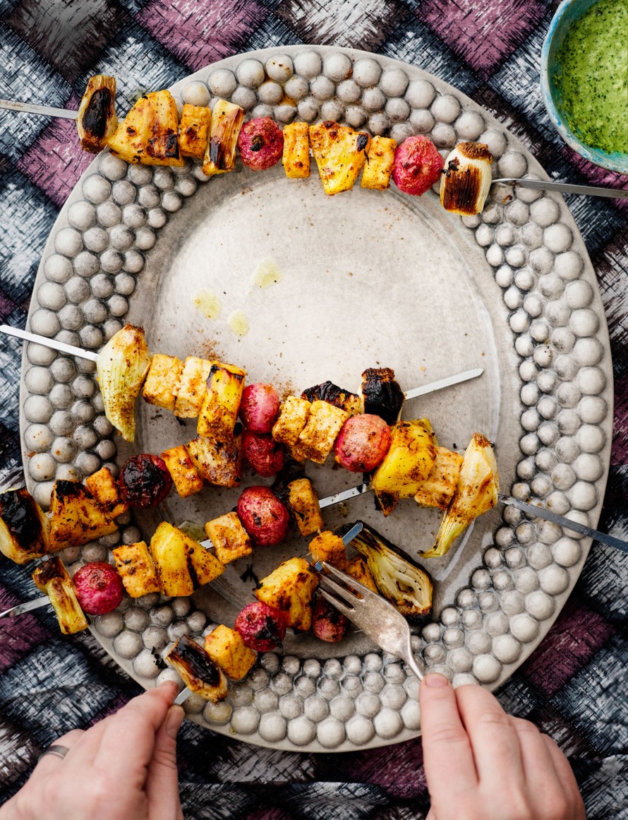 Paahteiset ananaspalat ja rapeat kasvikset sopivat täydellisesti vartaisiin rakenteeltaan kanaa muistuttavan quornin kanssa. Kasvissyöjän herkkuna tunnettu quorn valmistetaan sieniproteiinista.