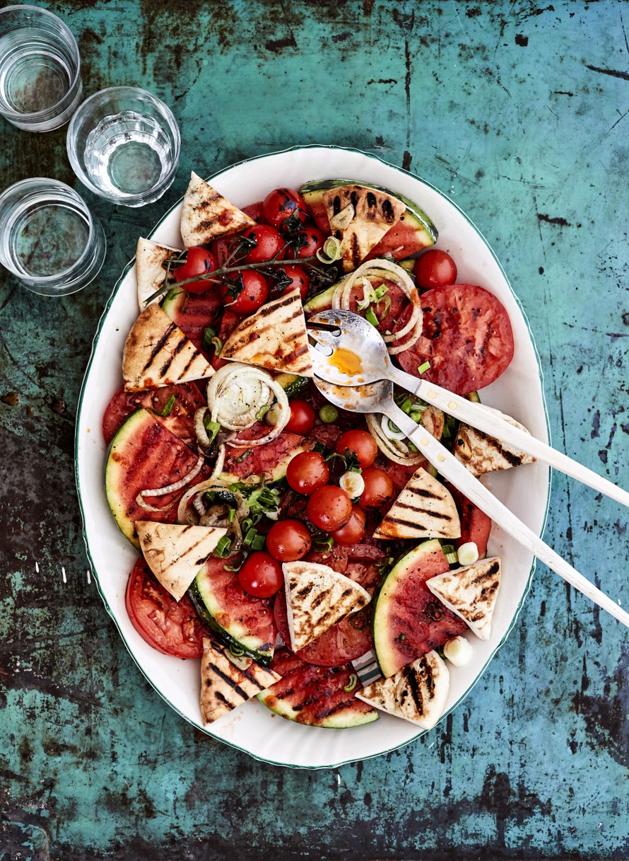 Tomaattien ja vesimelonien makeus nousee grillatessa pintaan. Tämä ihanan kesäinen, pitaleipäkolmioilla höystetty salaatti sopii lisukkeeksi kaikille kesän grilliherkuille.
