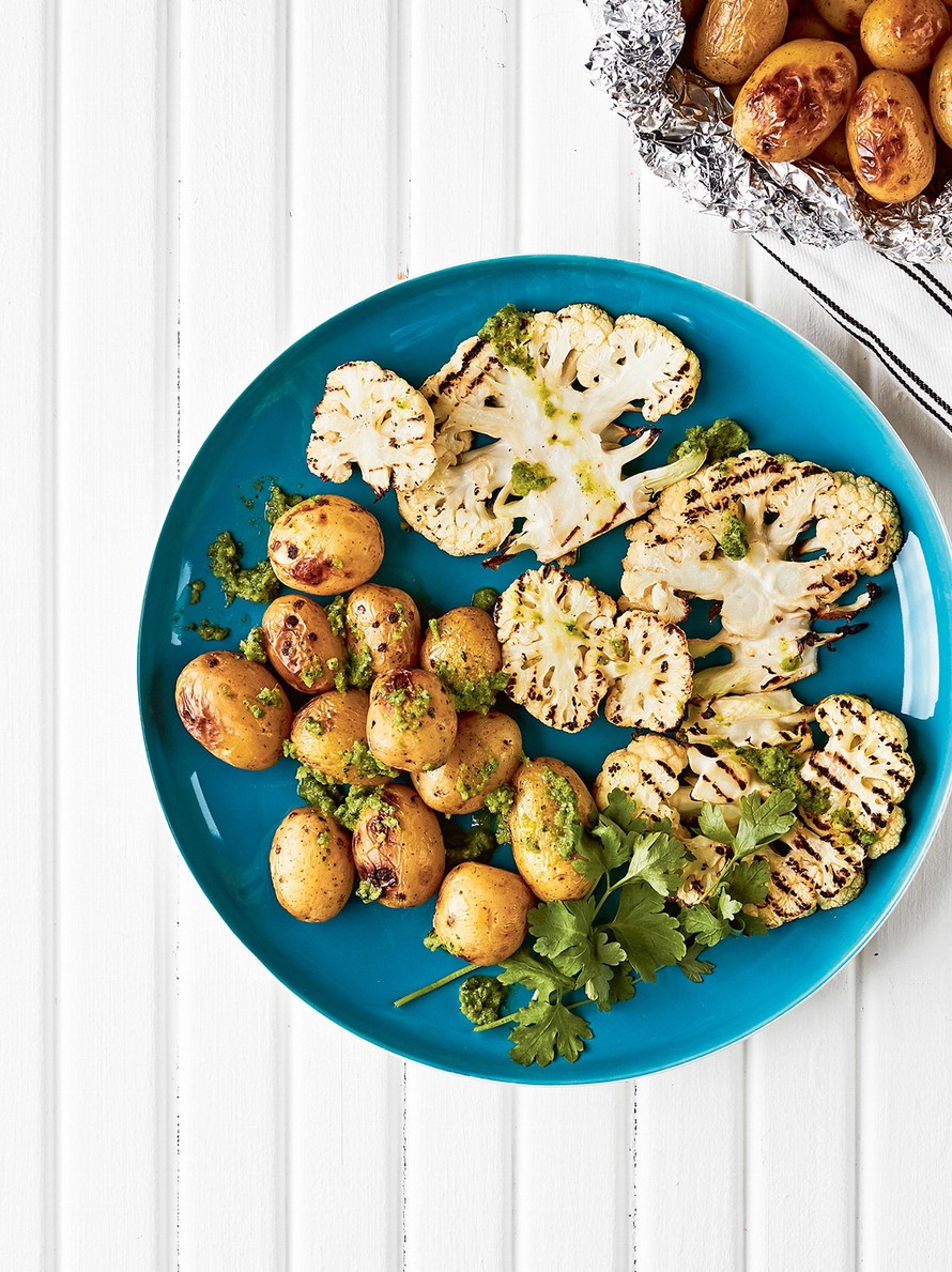 - Leikkaa kukkakaalit paksuiksi kiekoiksi. Pese perunat ja pakkaa ne avonyytiksi kaksinkertaiseen folioon. Lisää nyyttiin kiehuva vesi, öljy ja suola ja sulje nyytti kevyesti. Kypsennä grillissä noin 20–30 minuuttia perunoiden koosta riippuen. Tarkista kypsyys hammastikulla.